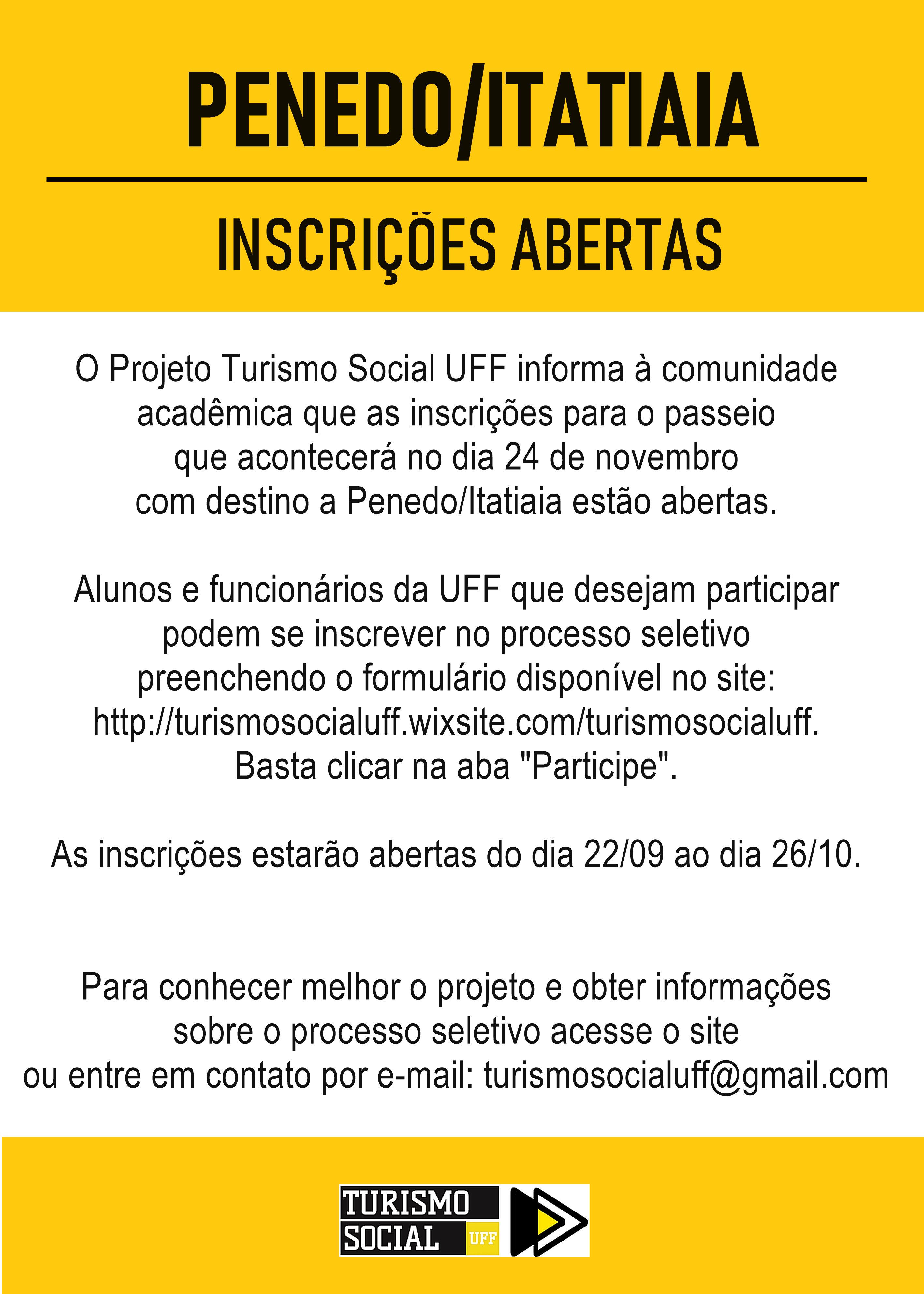 Em caso de dúvidas, acesse nosso site e clique na aba “Informações” ou envie um e-mail para turismosocialuff@gmail.com. Siga a página no Facebook para acompanhar nossas atividades e locais de inscrições presenciais: facebook.com/turismosocialuff.