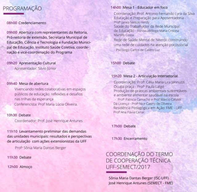 O objetivo do seminário é discutir e ampliar as principais ações de extensão realizadas pela parceria do Instituto de Saúde Coletiva, da Universidade Federal Fluminense (UFF), com a Secretaria Municipal de Educação, Ciência e Tecnologia de Niterói. Tendo por base a identificação das principais demandas da área da educação no município, o evento trará para o debate coletivo especialistas em educação e casos de experiências bem-sucedidas geradas pela parceria.