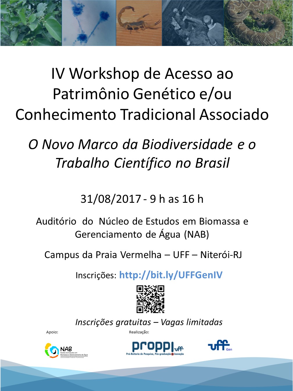 O Comitê de Acesso ao Patrimônio Genético e Conhecimento Tradicional Associado (UFFGEN) vinculado a Pró-reitoria de Pesquisa, Pós-graduação e Inovação (PROPPI) convida para o IV Workshop de Acesso ao Patrimônio Genético e/ou Conhecimento Tradicional Associado – O Novo Marco da Biodiversidade e o Trabalho Científico no Brasil no dia 31/08/2017 às 9h, no Auditório do Núcleo de Estudos em Biomassa e Gerenciamento de Água (NAB) Campus da Praia Vermelha.