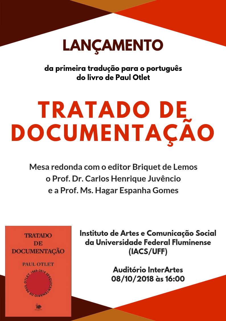 Mesa-redonda com o editor Briquet de Lemos, prof. Carlos Juvêncio (UFF/GCI) e prof. Hagar Espanha no dia 8 de outubro às 16 horas na sala Interartes do Instituto de Arte e Comunicação Social da UFF. O evento tem por objetivo divulgar a primeira tradução em português do Tratado de Documentação de Paul Otlet, obra de referência para as áreas de Biblioteconomia, Documentação e Ciência da Informação. A tradução para o português permitirá que todos os profissionais, estudantes e interessados tenham acesso às ideias desse importante pensador.