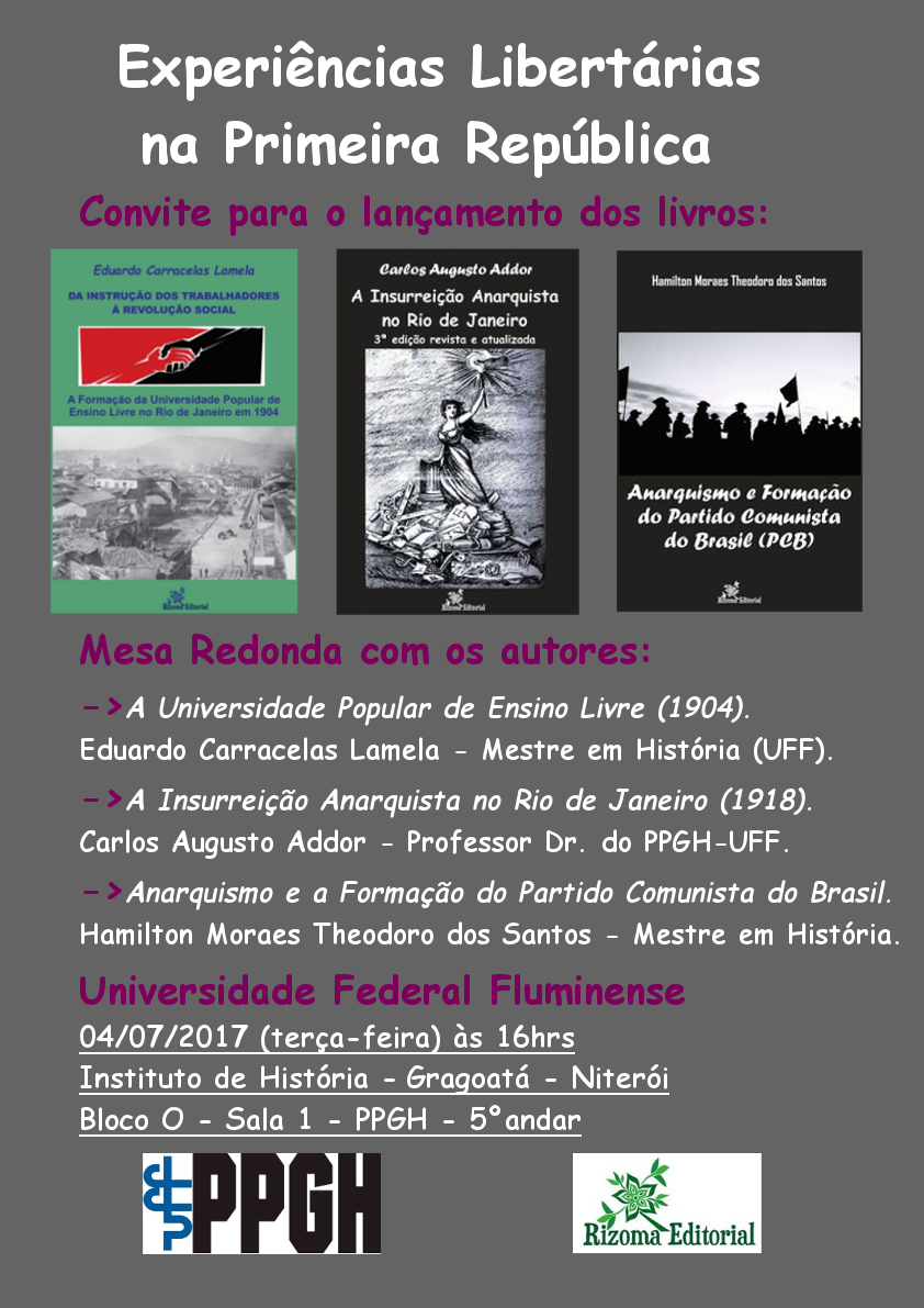Convido-os para o lançamento do livro “Da Instrução dos Trabalhadores à Revolução Social – a formação da Universidade Popular de Ensino Livre no Rio de Janeiro em 1904”, fruto da nossa dissertação de mestrado, defendida este ano no PPGH-UFF, que ocorrerá na Universidade Federal Fluminense, campus Gragoatá, no dia 4/7/2017 (terça-feira) às 16hrs. Neste dia será lançado também a 3ª ed., revista e ampliada, do livro “A Insurreição Anarquista no Rio de Janeiro”, do professor do PPGH-UFF Carlos Augusto Addor e ainda “Anarquismo e a Formação do Partido Comunista do Brasil”, de Hamilton de Moraes Theodoro dos Santos, mestre em história e professor da Seeduc-RJ. Teremos uma mesa redonda sobre os temas dos livros, seguida de uma sessão de autógrafos.