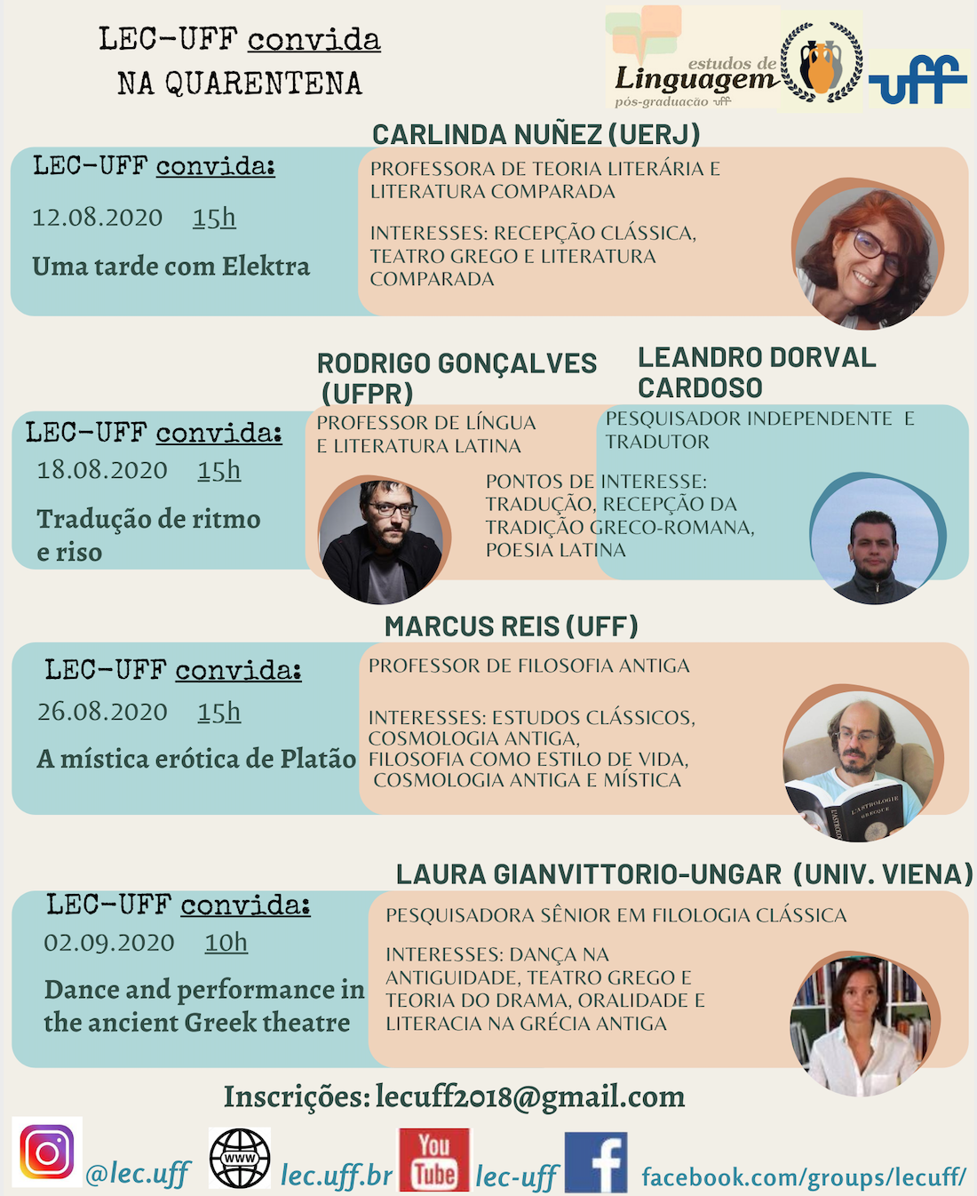 O Laboratório de Estudos Clássicos da Universidade Federal Fluminense, que congrega professores das áreas relacionadas com os estudos da história, da filosofia, da arte, da literatura e da língua grega e latina, irá promover, com o amplo público – de dentro e de fora da universidade -, encontros semanais que proporcionarão um maior contato com os pesquisadores do LEC, criando, assim, um ambiente em que trocas de saberes e experiências serão o nosso maior enfoque.