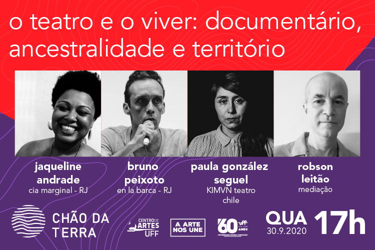 Dentro do projeto Chão da Terra, o encontro virtual “O Teatro e o Viver: documentário, ancestralidade e território”, trará grupos teatrais que falarão sobre espetáculos com elementos identitários e que colocam em evidência questões sociais e culturais de comunidades específicas. Participam do encontro Jaqueline Andrade, representante da Cia Marginal (Rio de Janeiro), Paula González Seguel, representante do grupo mapuche KIMVN Teatro (Chile), Bruno Peixoto, representante do coletivo En La Barca Jornadas Teatrais (Rio de Janeiro), e Robson Leitão (diretor do Teatro da UFF), que fará a mediação. Esta edição do Chão da Terra será no dia 30 de setembro, às 17h, com transmissão pelas redes sociais do Centro de Artes UFF.
