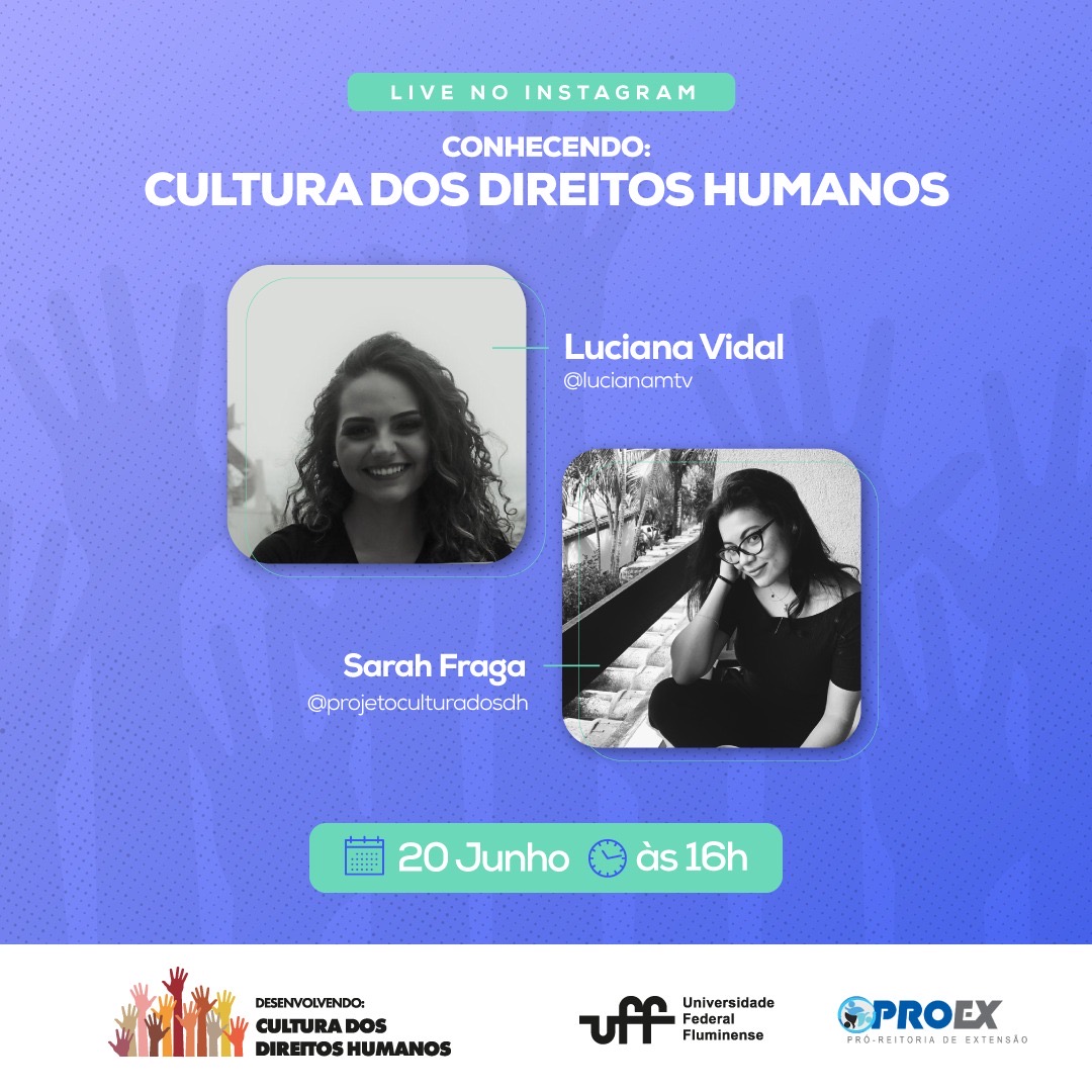 #ProexEmAção divulga a Live Conhecendo: Cultura dos Direitos Humanos do projeto de extensão Desenvolvendo: Cultura dos Direitos Humanos na infância e adolescência no dia 20/06 às 16h. As voluntárias do projeto Luciana e Sarah, irão bater um papo sobre o projeto de extensão via Instagram: @projetoculturadosdh. Participe!