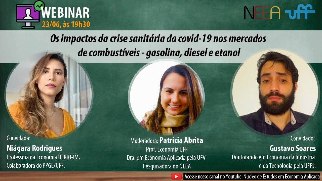 Live promovida pelo Núcleo de Estudos em Economia Aplicada (NEEA) da Universidade Federal Flumiense (UFF Campos) sobre “Os impactos da crise sanitária da covid-19 nos mercados de combustíveis – gasolina, diesel e etanol”, com os convidados Gustavo Soares, doutorando em Economia da Indústria e da Tecnologia pela UFRJ, e Niágara Rodrigues, professora da Economia UFRRJ-IM, colaboradora do PPGE/UFF. Moderadora: Patricia, professora de Economia UFF-Campos dos Goytacazes.