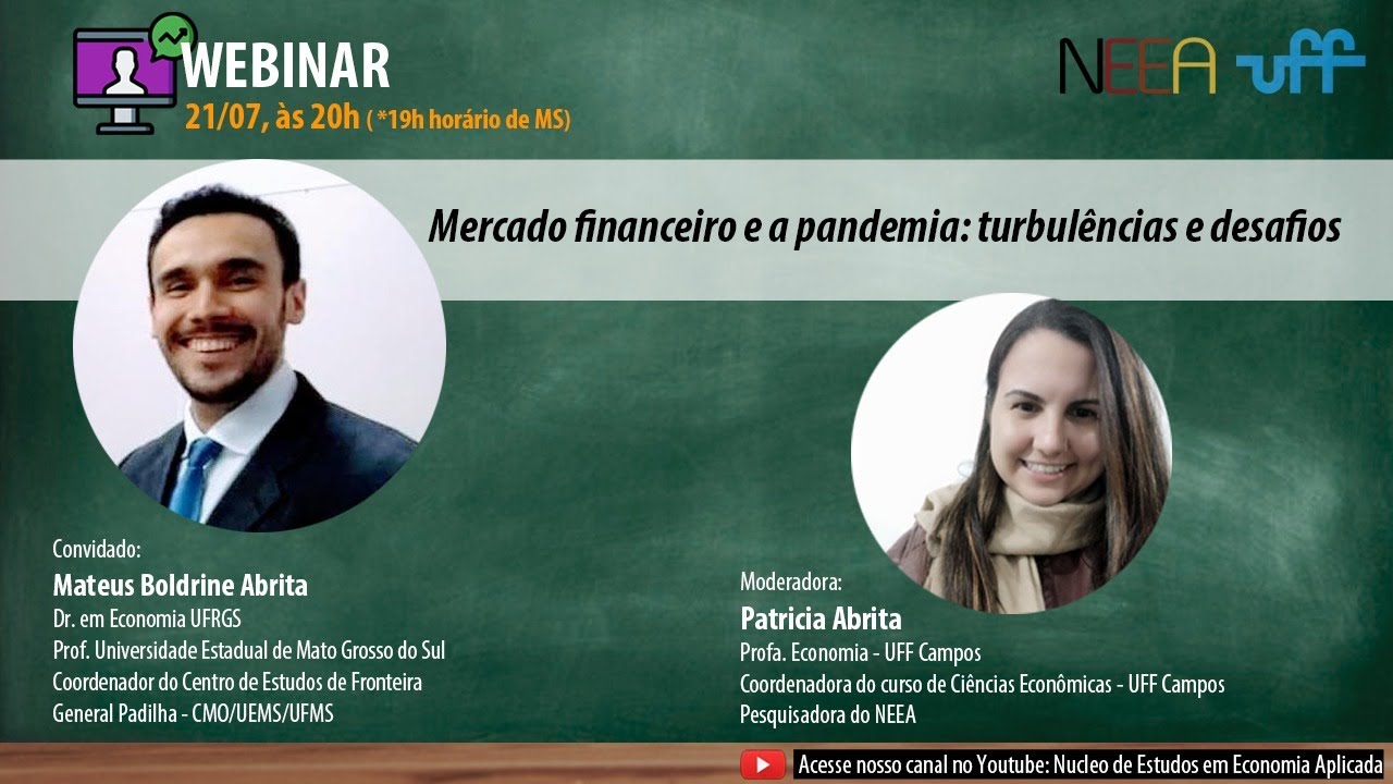 Live promovida pelo Núcleo de Estudos em Economia Aplicada (NEEA – UFF Campos) sobre “Mercado financeiro e a pandemia: turbulências e desafios”, com o convidado Mateus Boldrine Abrita, Prof. Universidade Estadual de Mato Grosso do Sul , assessor de relações interinstitucionais na UEMS e Coordenador do Centro de Estudos de Fronteira General Padilha. Moderadora: Patricia de Melo Abrita Bastos professora do curso de Ciências Econômicas da Universidade Federal Fluminense e pesquisadora do NEEA.