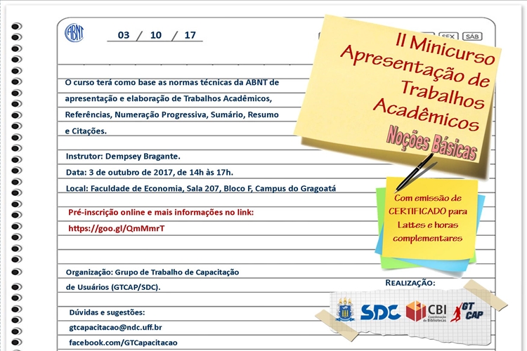 O curso terá como base as normas técnicas da ABNT de apresentação e elaboração de Trabalhos Acadêmicos, Referências, Numeração Progressiva, Sumário, Resumo e Citações.