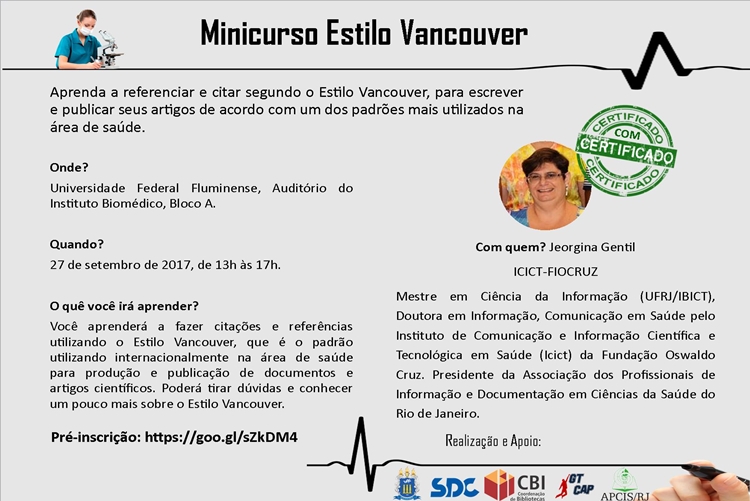 O quê você irá aprender? Você aprenderá a fazer citações e referências utilizando o Estilo Vancouver, que é o padrão utilizando internacionalmente na área de saúde para produção e publicação de documentos e artigos científicos. Poderá tirar dúvidas e conhecer um pouco mais sobre o Estilo Vancouver.