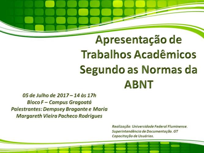 A Superintendência de Documentação (SDC), através do seu Grupo de Trabalho de Capacitação de Usuários (GTCAP) oferece à comunidade acadêmica e externa o minicurso sobre as normas da ABNT para trabalhos acadêmicos e normas relacionadas.