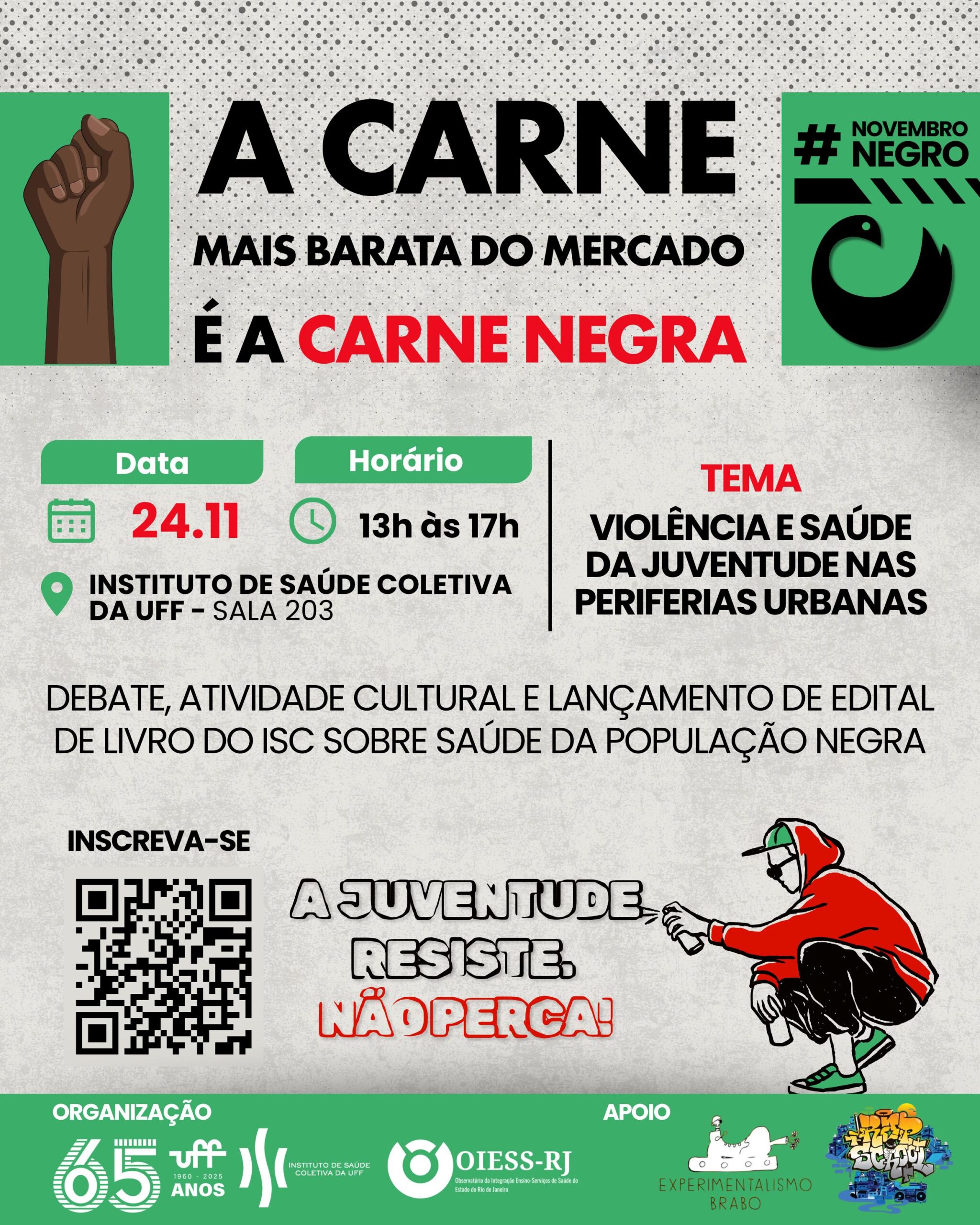 O Grupo de Trabalho para Políticas Antirracistas realiza, no dia 24 de novembro de 2025, o evento “A Carne Mais Barata do Mercado é a Carne Negra”, que nesta edição traz o tema “Violência e Saúde da Juventude nas Periferias Urbanas”. A atividade acontece das 13h às 17h, na Sala 203 do Instituto de Saúde Coletiva (ISC/UFF), localizado na Rua Marquês do Paraná, 303, 2º andar, prédio anexo ao HUAP, em Niterói (RJ).