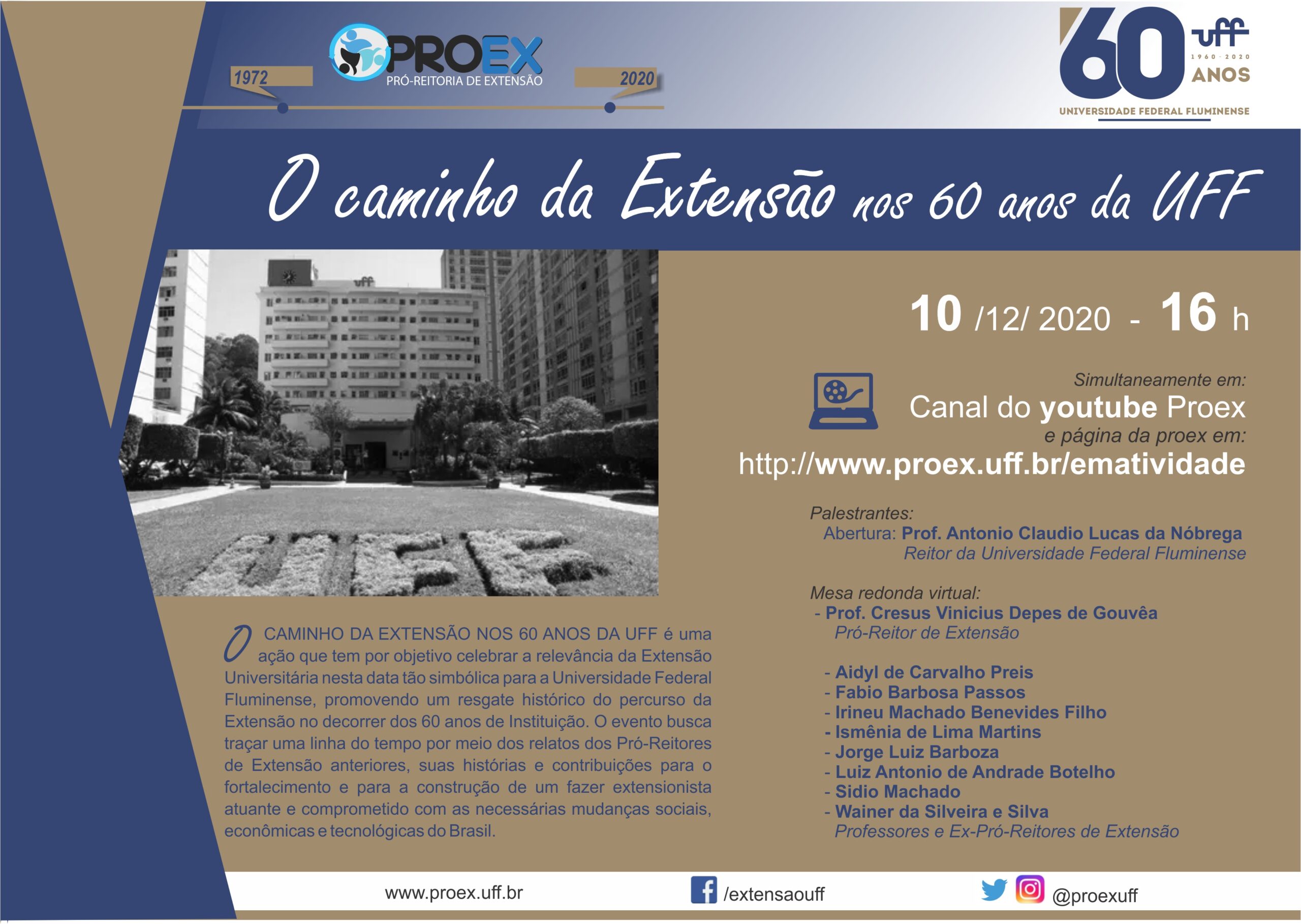 O CAMINHO DA EXTENSÃO NOS 60 ANOS DA UFF é uma ação que tem por objetivo celebrar a relevância da Extensão Universitária nesta data tão simbólica para a Universidade Federal Fluminense, promovendo um resgate histórico do percurso da Extensão no decorrer dos 60 anos de Instituição. O evento busca traçar uma linha do tempo por meio dos relatos dos Pró-Reitores de Extensão anteriores, suas histórias e contribuições para o fortalecimento e para a construção de um fazer extensionista atuante e comprometido com as necessárias mudanças sociais, econômicas e tecnológicas do Brasil.