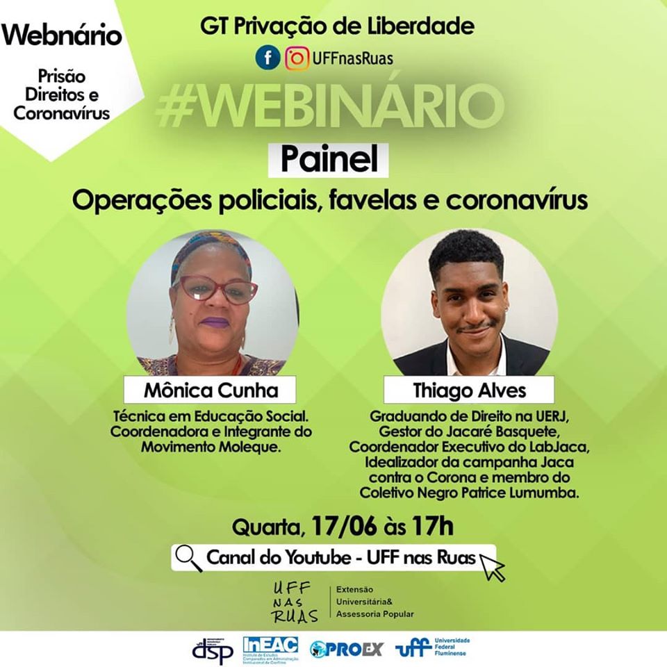 do Webinário Prisão, Direitos e Coronavírus amanhã, dia 17/06 às 17 horas com convidados incríveis Monica Cunha e Thiago Alves, que além de suas vivências/experiências estão no front na luta contra o coronavírus e contra as execuções policiais nas favelas. Vai ser um debate potente sobre Atuações policiais, favelas e coronavírus.