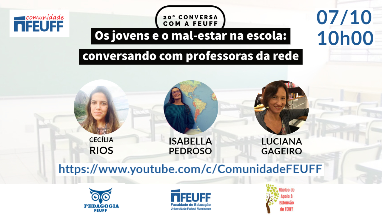 A nossa próxima Conversa com a FEUFF (07/10) terá como tema “Os jovens e o mal-estar na escola: conversando com professoras da rede” e contará com a participação das professoras Cecília Rios, Isabella Pedroso e Luciana Gageiro. Ela acontecerá, extraordinariamente, no horário da manhã, às 10h00.