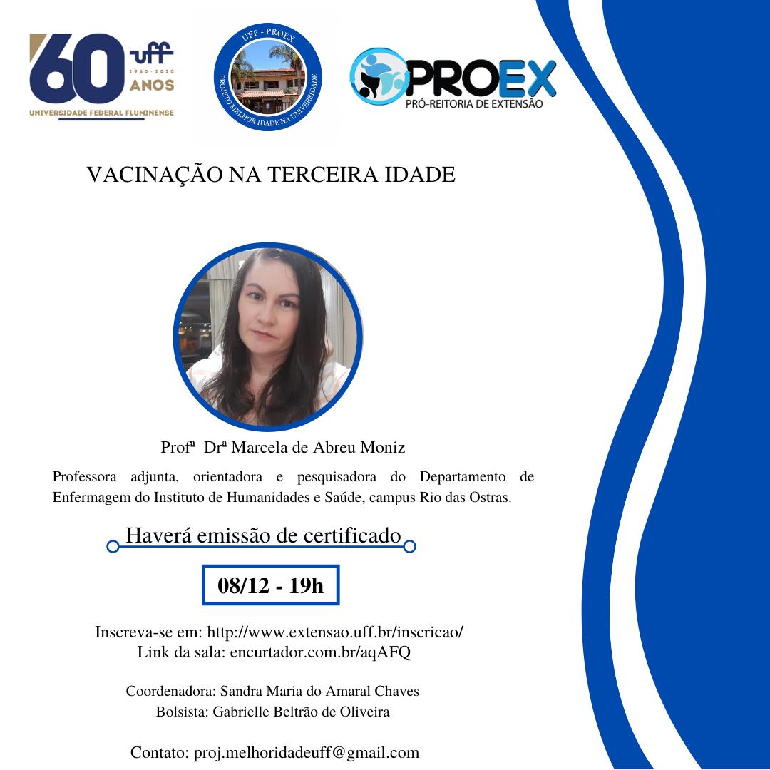 Palestra – Vacinação na terceira idade com a Dra. Marcela de Abreu Moniz, professora adjunta, orientadora e pesquisadora do Departamento de Enfermagem do Instituto de Humanidades e Saúde, do Campus Rio das Ostras.
