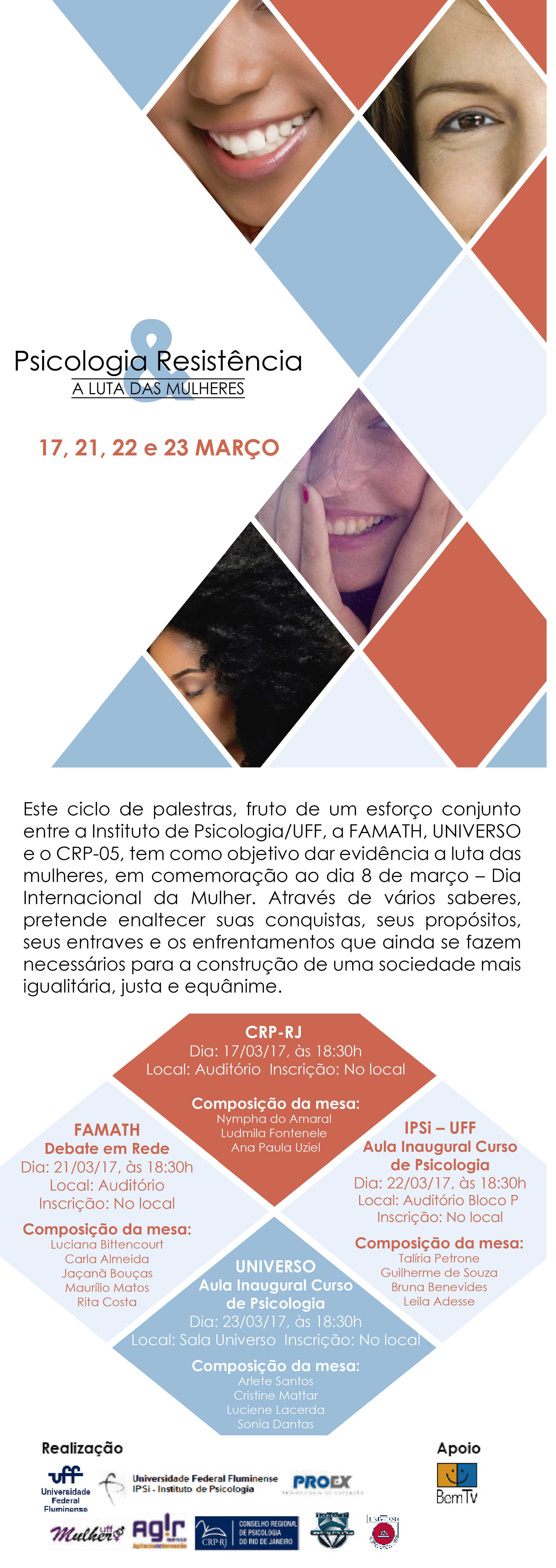 Nos dias 17, 21, 22 e 23 de março acontecerá o ciclo de palestras “Psicologia & Resistência: a luta das mulheres”, fruto de um esforço conjunto entre o Instituto de Psicologia da UFF, Faculdades Integradas Maria Thereza (FAMATH), Universidade Salgado de Oliveira (UNIVERSO) e o Conselho Regional de Psicologia 5ª Região (CRP-05). O evento tem como objetivo dar evidência à luta das mulheres, em comemoração ao dia 8 de março – Dia Internacional da Mulher.  Por meio de vários saberes, pretende-se enaltecer suas conquistas, seus propósitos, seus entraves e os enfrentamentos que, ainda, se fazem necessários para a construção de uma sociedade mais igualitária, justa e equânime.