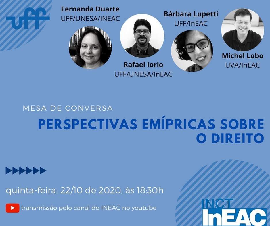 Nesta quinta-feira, às 18:30h, receberemos Fernanda Duarte (UFF/UNESA/InEAC), Rafael Iorio (UFF/UNESA/InEAC), Bárbara Lupetti (UFF/InEAC) e Michel Lobo (UVA/InEAC) para conversar sobre o tema “Perspectivas empíricas sobre o direito”.