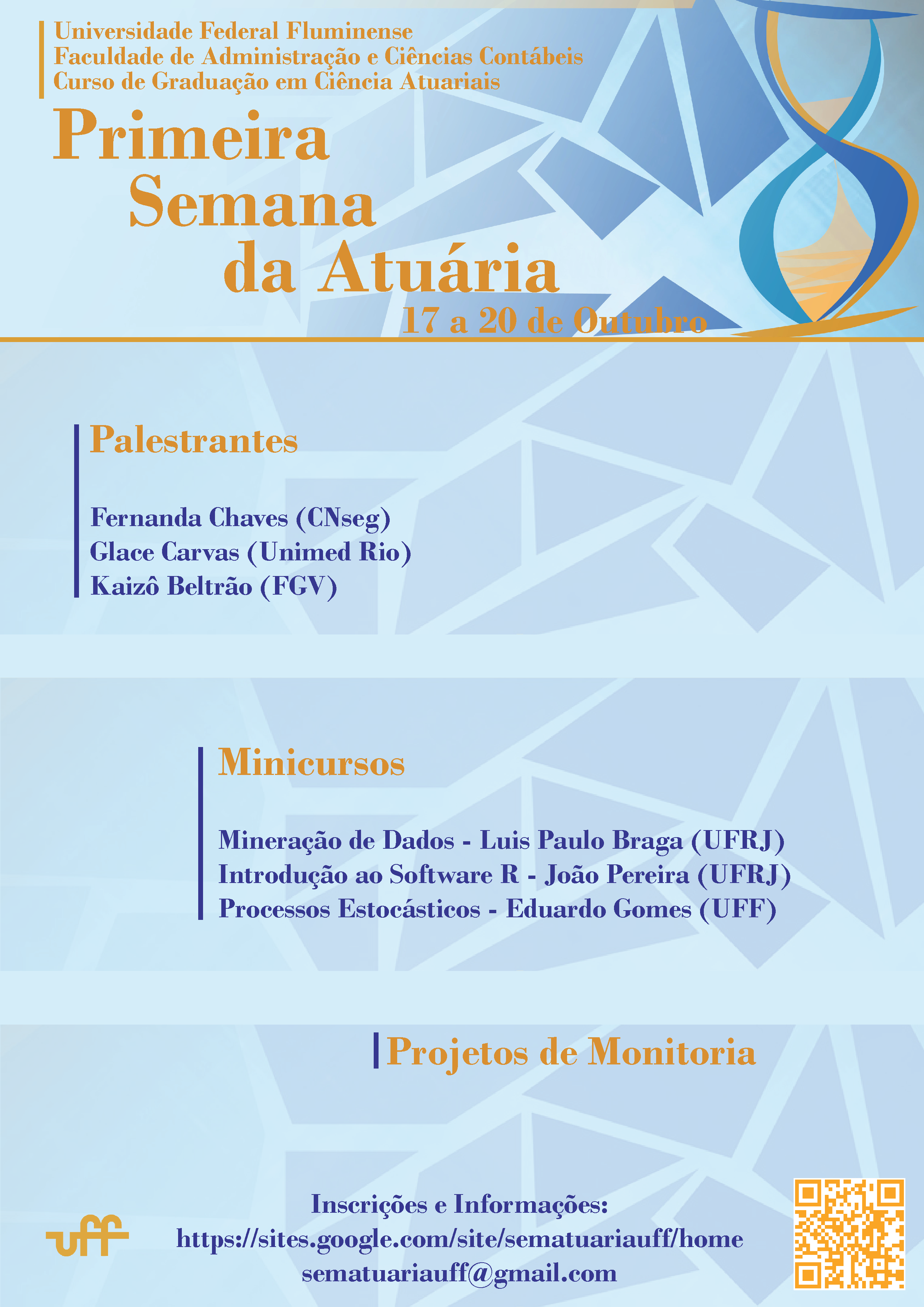 Nos dias 17 a 20 de outubro, a coordenação do Curso de Graduação em Ciências Atuarias da UFF promove a Primeira Semana da Atuária, evento que integra a Agenda Acadêmica da Universidade Federal Fluminense. Com a colaboração de docentes e pesquisadores das principais instituições de ensino superior do Rio de Janeiro e de profissionais de destaque do mercado atuarial, o encontro conta com uma série de palestras, minicursos e outras atividades.