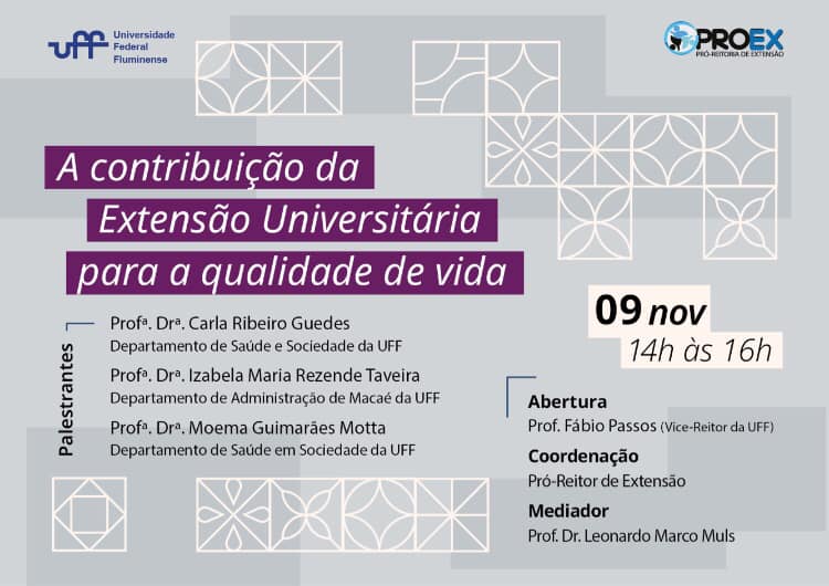 #ProexEmAção divulga a live A Contribuição da Extensão Universitária para a qualidade de vida. A abertura será feita pelo professor Fabio Barboza Passos Vice-Reitor/UFF, coordenação professor Cresus Vinicius Depes de Gouvêa Pró-Reitor de Extensão – UFF e mediada pelo professor Leonardo Marco Muls.
