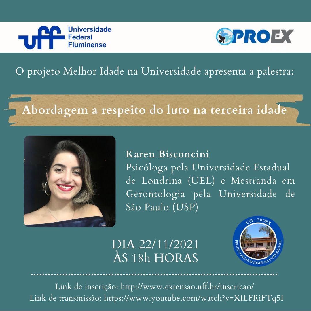 #ProexEmAção divulga a live Abordagem a respeito do luto na terceira idade, no dia 22/11 às 18h . O evento é coordenado pela professora Sandra Chaves do Pólo de Rio das Ostras – UFF.