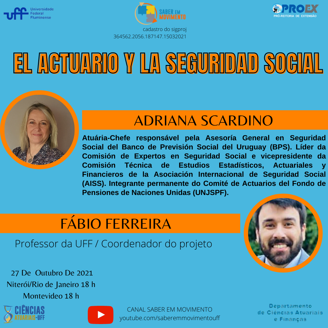 #ProexEmAção divulga em parceria com o projeto de extensão Saber em Movimento coordenado pelo professor Fábio Ferreira – UFF, a Live “El Actuario y la Seguridad Social” no dia 27/10/21 às 18h. O evento será transmitido pelo canal do projeto.