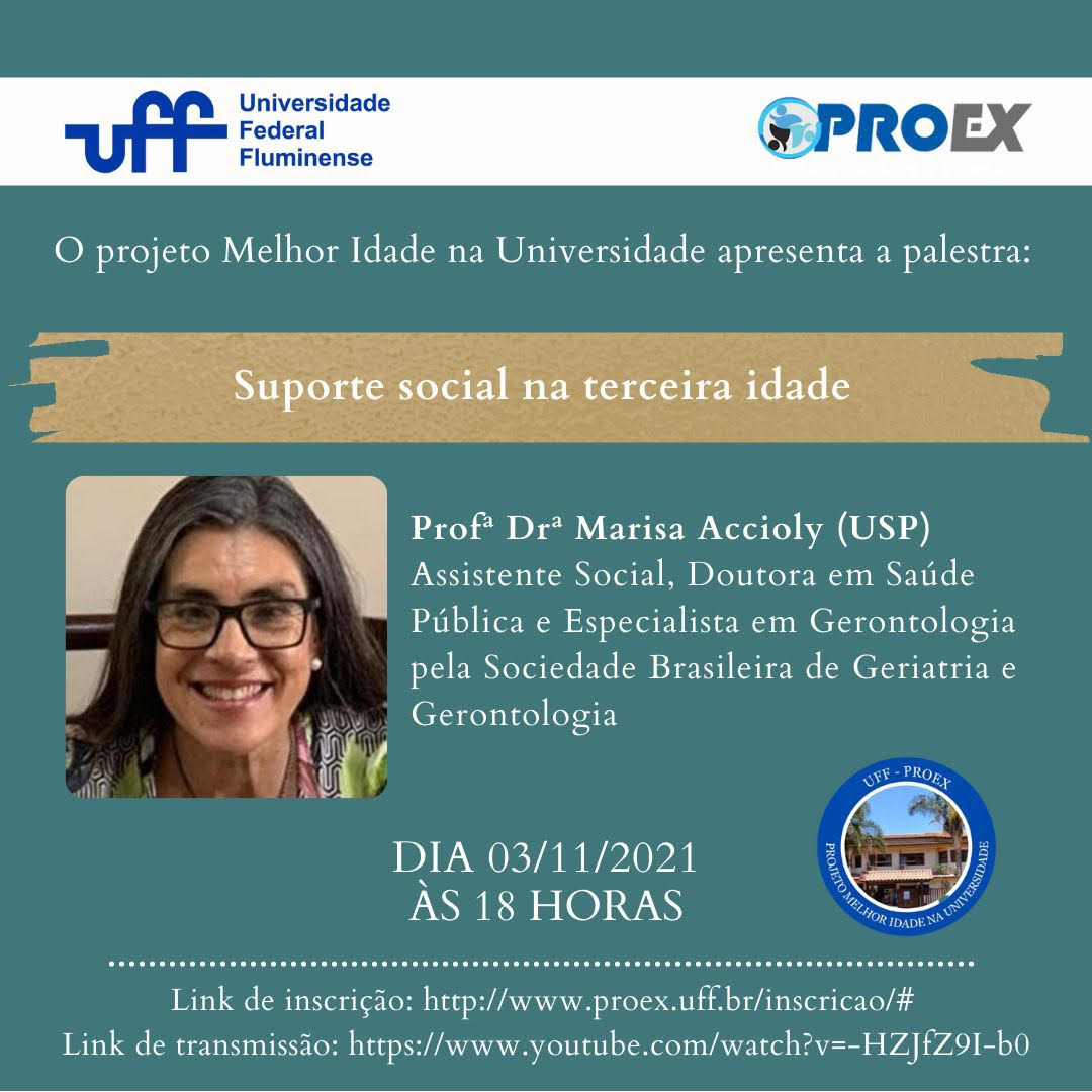 #ProexEmAção divulga a live com o tema: “Suporte social na terceira idade”, no dia 03/11/21 às 18h. O evento é coordenado pela professora Sandra Chaves do Pólo de Rio das Ostras – UFF. A palestrante convidada será a professora Marisa Accioly Domingues Doutora em Saúde Pública, especialista em Gerontologia pela Sociedade Brasileira de Geriatria e Gerontologia. Docente do Curso de Gerontologia da Escola de Artes, Ciência e Humanidades da USP.