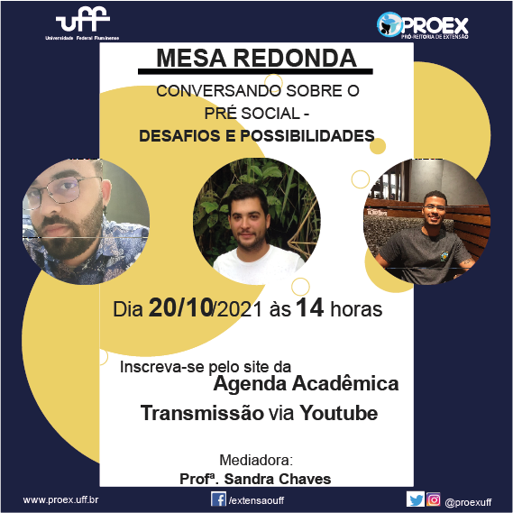 #ProexEmAção divulga a mesa redonda Conversando sobre o Pré – social: Desafios e Possibilidades, coordenado pela professora Sandra Chaves da UFF de Rio das Ostras. A mesa redonda entre os instrutores do Pré-Social das áreas de Exatas, Humanas e Biológicas consiste em discutir sobre a infraestrutura do Pré, quais são as dificuldades vistas em cada uma das áreas na modalidade a distância, bem como, contar como foi a experiência de cada um dos instrutores que participarão do debate.