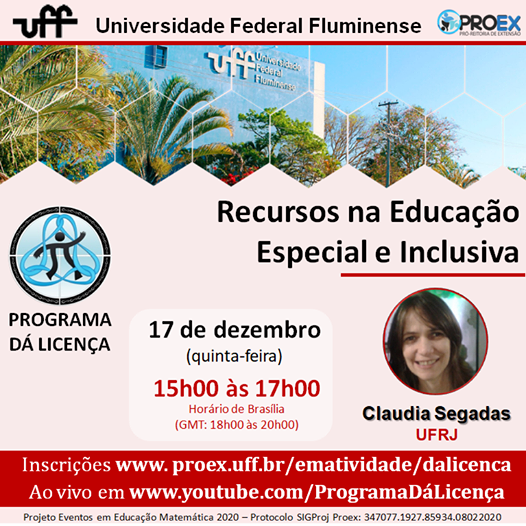 #ProexEmAção divulga em parceria com o Programa Dá Licença e o projeto Eventos em Educação Matemática a oficina “Recursos na Educação Especial e Inclusiva”, a ser ministrada pela professora Claudia Segadas (UFRJ). O objetivo do evento é mostrar como o uso de recursos: materiais e humanos atuam na educação especial. Apresentaremos exemplos de atividades de Matemática em que os recursos promovem acessibilidade. Discutiremos o papel dos mediadores em prol de uma educação inclusiva.