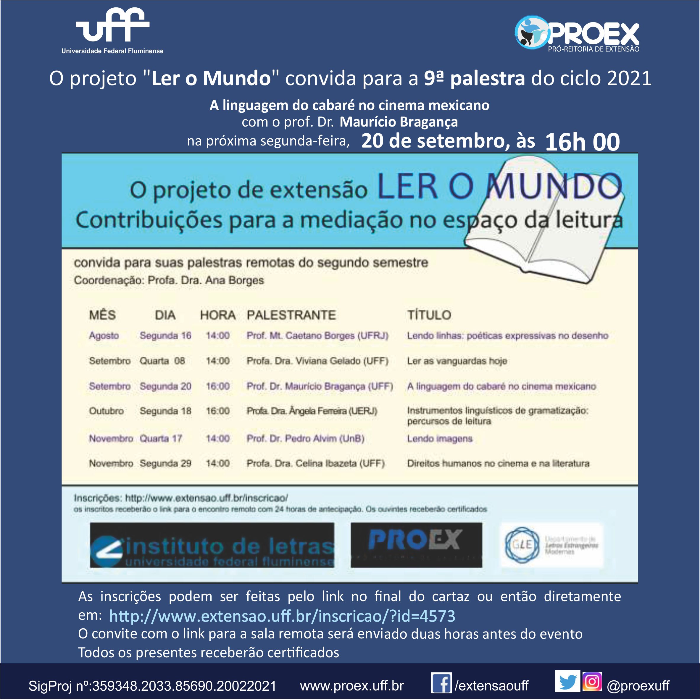 #ProexEmAção em parceria com o projeto de extensão “Ler o Mundo: contribuições para a mediação no espaço da leitura” coordenado pela professora Ana Isabel Guimarães Borges. Divulga a nona palestra do ciclo 2021, “A linguagem do cabaré no cinema mexicano” com o professor Maurício Bragança, no dia 20/09 às 16h.