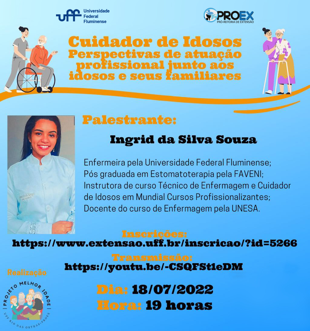 #ProexEmAção o projeto de extensão Melhor Idade, coordenado pela professora Sandra Chaves do Pólo de Rio das Ostras – UFF, divulga a palestra com o tema: Cuidador de Idosos perspectivas de atuação profissional junto aos idosos e seus familiares, no dia 18/07/2022 às 19h.