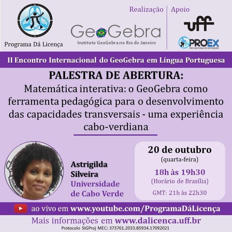 #ProexEmAção divulga em parceria com o programa de extensão Dá Licença a palestra de abertura do II ENCONTRO INTERNACIONAL DO GEOGEBRA EM LÍNGUA PORTUGUESA, “Matemática interativa: o GeoGebra como ferramenta pedagógica para o desenvolvimento das capacidades transversais – uma experiência cabo-verdiana”
