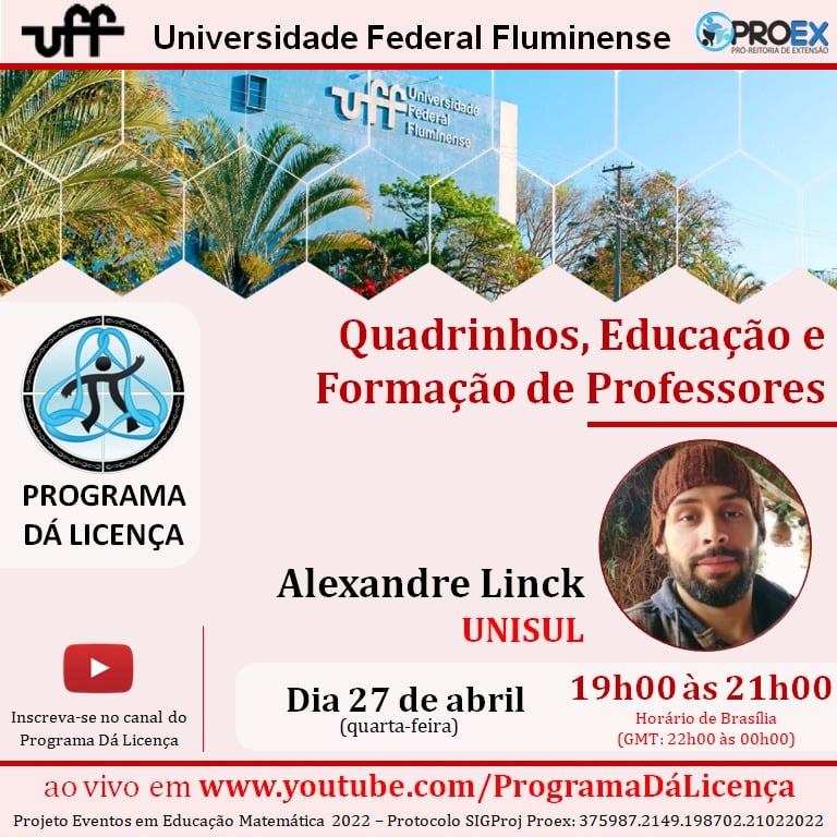 O professor Alexandre Linck é professor, pesquisador e realiza divulgação científica, curadoria e crítica de quadrinhos em seu canal do YouTube, o “Quadrinhos na Sarjeta”. Nesse encontro, ele compartilhará sua experiência e reflexões sobre a intersecção entre HQ, Educação e Formação de Professores.