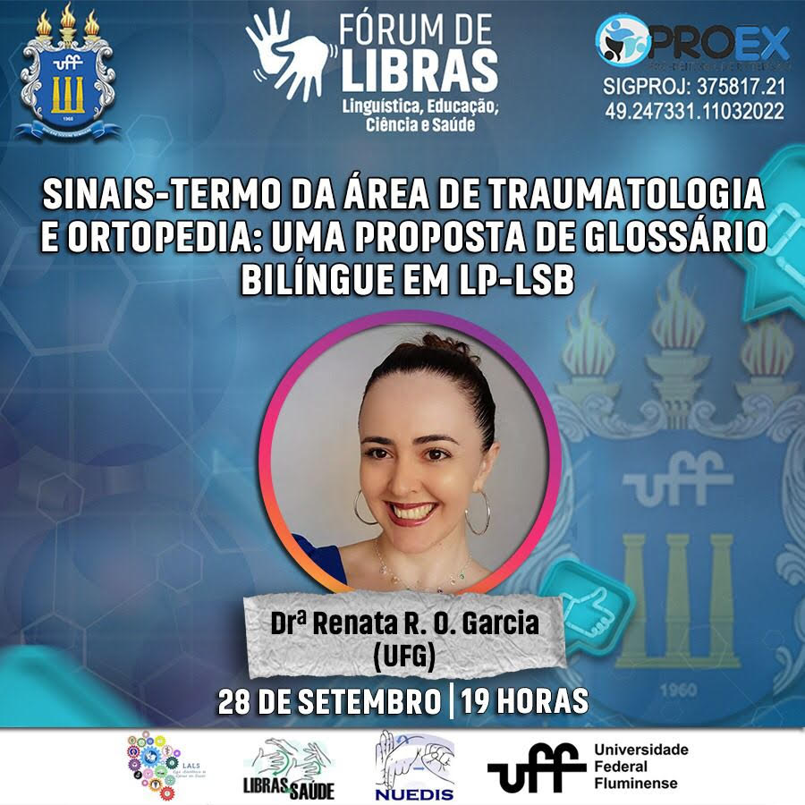 Audiodescrição: Card de fundo azul, escrito em letras brancas “Sinais-termo da área de traumatologia e ortopedia: uma proposta de glossário bilíngue em LP-LSB”. Abaixo, no centro da imagem, a foto da palestrante Dra. Renata R. O. Garcia (UFG), no formato arredondado. Mulher branca sorrindo com cabelo preso aparentemente cor preto.