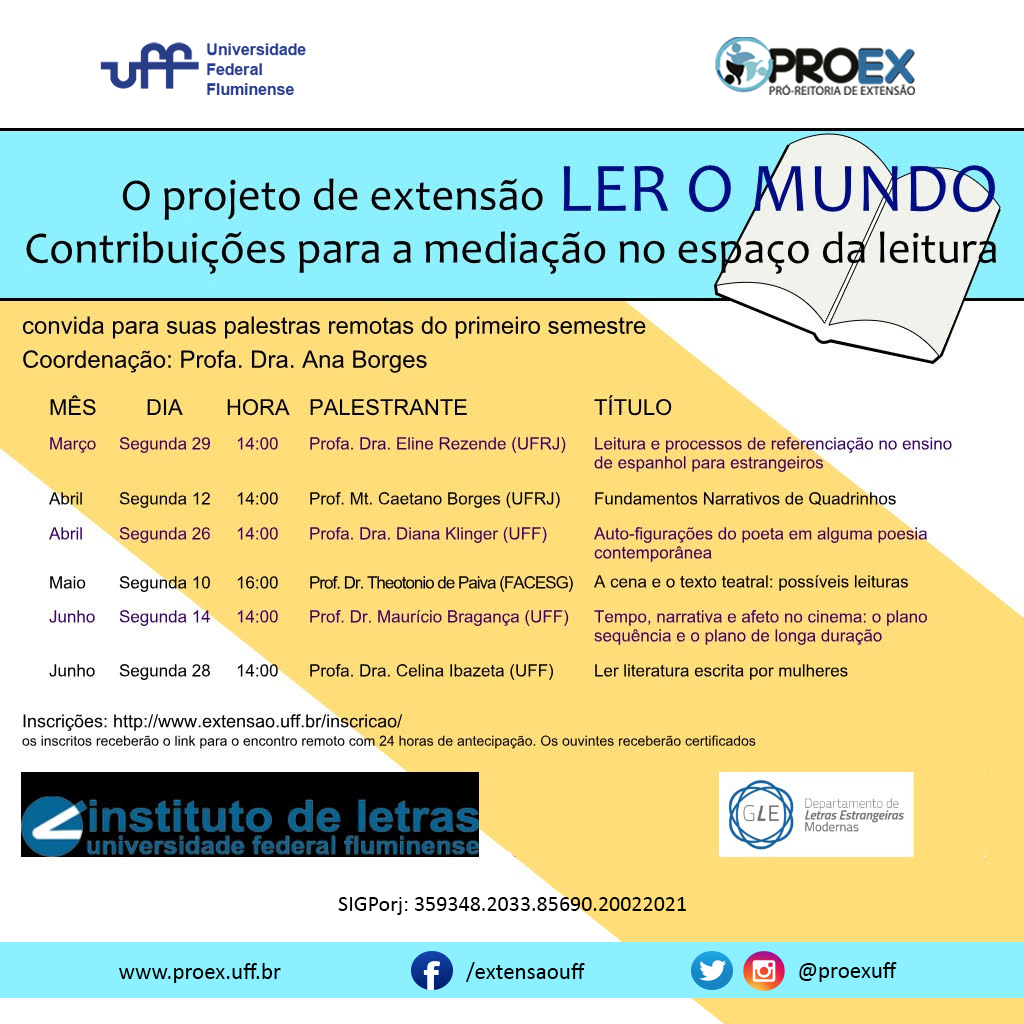 #ProexEmAção em parceria com o projeto de extensão “Ler o Mundo: contribuições para a mediação no espaço da leitura” coordenado pela professora Ana Isabel Guimarães Borges do Instituto de Letras – UFF, divulga a sexta palestra: Ler Leitura Escrita por Mulheres com o professora Celina Ibazeta (UFF) no dia 28/06 às 14h:00