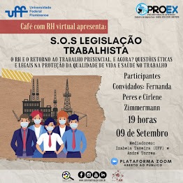 #ProexEmAção divulga em parceria com o projeto de extensão Café com RH – UFF Macaé o evento virtual: SOS Legislação Trabalhista : O RH e o retorno ao trabalho presencial. E agora? Questões éticas e legais na proteção da qualidade de vida e saúde no trabalho. O evento será no dia 09/09 às 17h, na plataforma ZOOM.