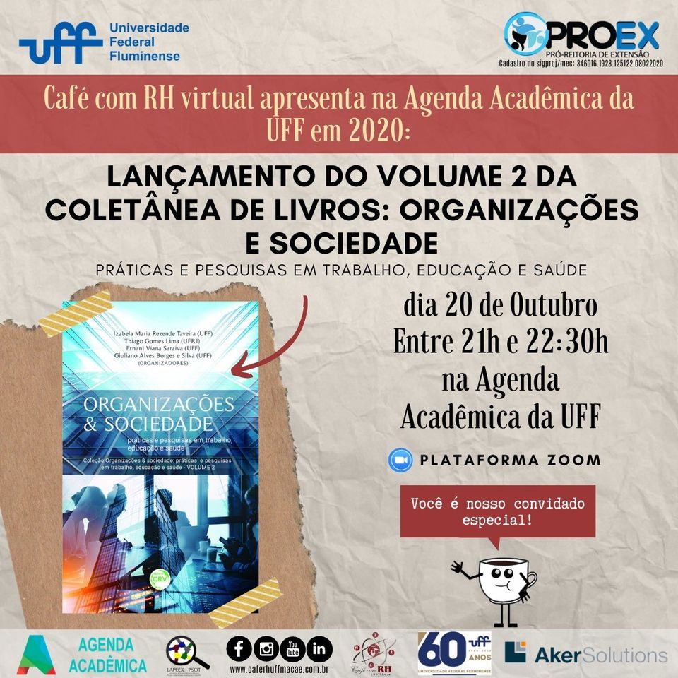 #ProexEmAção divulga em parceria com o projeto de extensão Café com RH UFF Macaé, o lançamento do volume 2 da coletânea ” Organizações e Sociedade: práticas e pesquisas em trabalho, educação e saúde”, no dia 20/10 das 21h às 22h:30 na Agenda Acadêmica pela plataforma ZOOM.