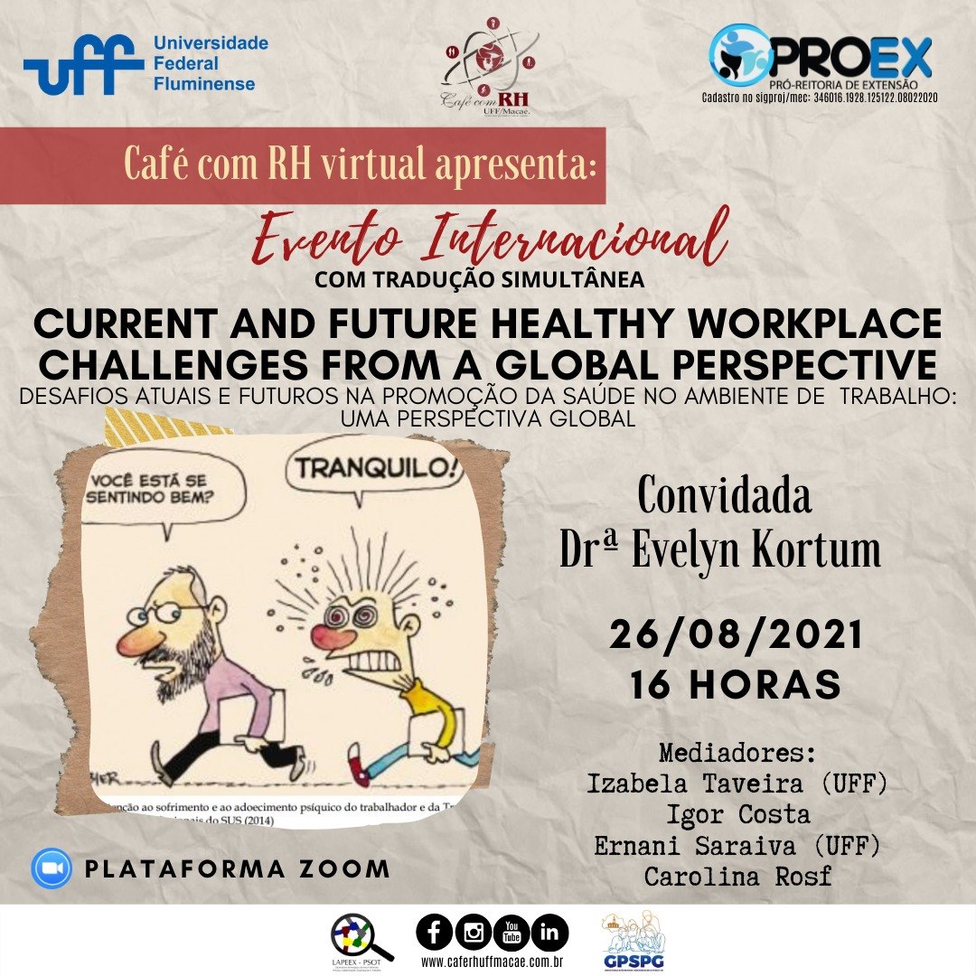 #ProexEmAção divulga em parceria com o projeto de extensão Café com RH – UFF Macaé coordenado pela professora Izabela Taveira – UFF,  o evento internacional “Desafios atuais e futuros na promoção da saúde no ambiente de trabalho” no dia 26/08  às 16h O objetivo  é discutir sobre os desafios globais relativos  na promoção da saúde no ambiente de trabalho . Para refletir sobre essa questão o segundo evento  internacional, que contará com a presença da Evelyn Kortum, especialista em saúde e segurança no trabalho com formação especializada em psicologia do trabalho. Trabalhou na Organização mundial da saúde ( OMS) e na federação das associações internacionais de funcionários públicos ( FICSA), membro da Comissão internacional de saúde ocupacional ( ICOH) da associação americana de psicologia (APA) e da sociedade britânica de Psicologia ( BPS), doutorado em Psicologia aplicada pela universidade de Nottinghan e mestrado em psicologia ocupacional pela Birkbeck College. Sua graduação foi em Psicologia.