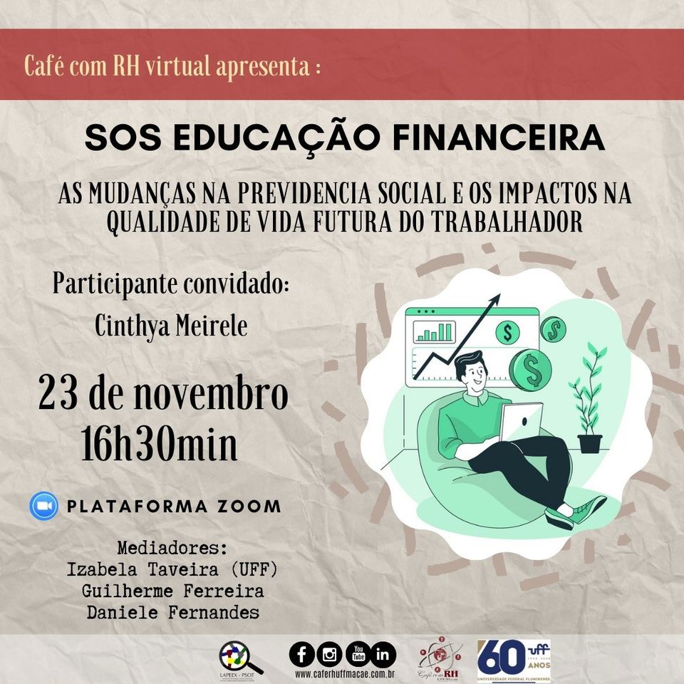 #ProexEmAção divulga em parceria com o projeto de extensão Café com RH UFF Macaé. O evento online pela plataforma ZOOM “SOS Educação Financeira: As mudanças na previdência social e os impactos na qualidade de vida do trabalhador, no dia 23/11 às 16h:30