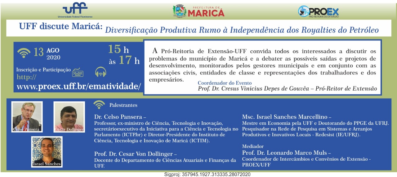 #ProexEmAção divulga o evento virtual: Diversificação Produtiva Rumo à Independência dos Royalties do Petróleo, no dia 13/08 das 15h às 17h. Tendo como público-alvo: Comunidade acadêmica, estudantes e sociedade em geral, com foco em gestores públicos, atores do sistema produtivo, representações de classe, organizações sindicais, cooperativas, empreendedores e lideranças dos movimentos sociais. O evento será coordenado pelo professor Cresus Vinicius Depes de Gouvêa, Pró-Reitor de Extensão – UFF, e o mediador o professor Leonardo Marco Muls, Coordenador de Intercâmbio e Convênios de Extensão. Participe!