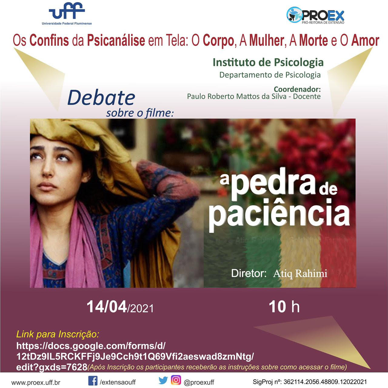 #ProexEmAção e o projeto de extensão Os Confins da Psicanálise em Tela: O Corpo, A Mulher, A Morte e O Amor coordenado pelo professor Paulo Roberto Mattos da Silva do Instituto de Psicologia – UFF. Convidam a todos para exibição e discussão do filme “Pedra da Paciência” no dia 14/04/21 às 10h.