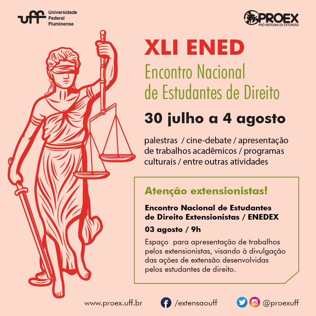 No dia 03/08, às 9h, teremos um espaço denominado “Encontro Nacional de Estudantes de Direito Extensionistas – ENEDEX”