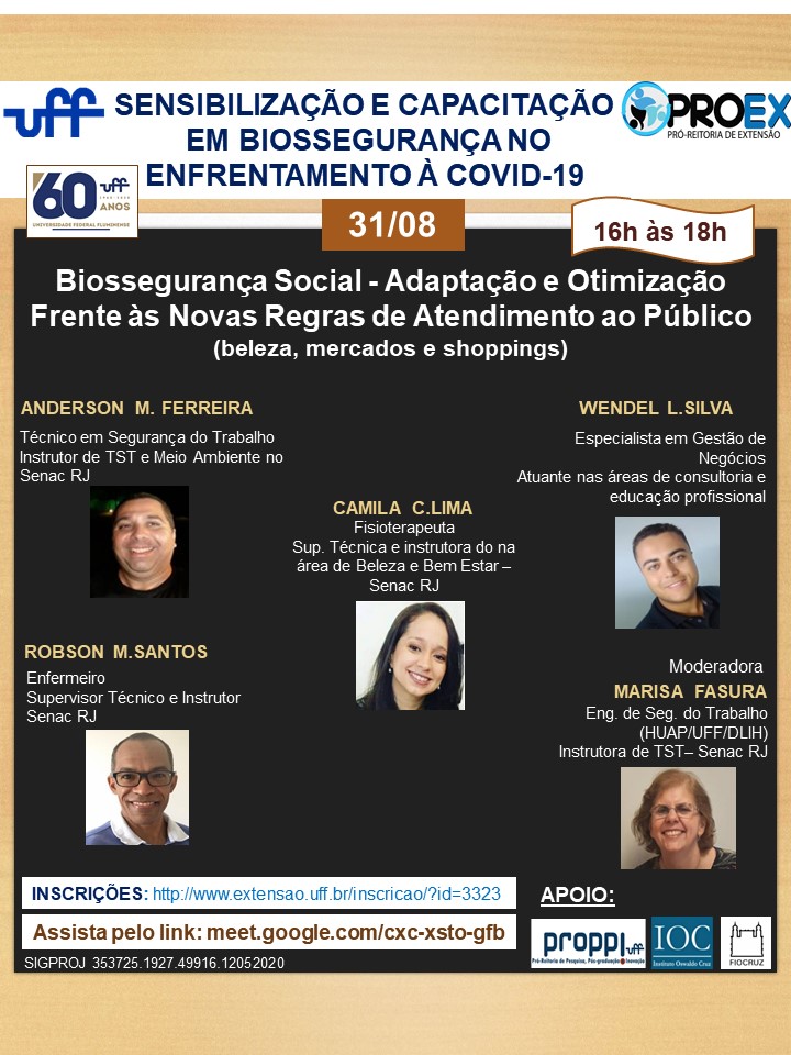 #ProexemAção divulga o evento online Sensibilização e Capacitação em Biossegurança no Enfrentamento da COVID – 19 “Biossegurança Social – Adaptação e Otimização Frente às Novas Regras de Atendimento ao Público (beleza, mercados e shopping), do Programa de Sensibilização e Capacitação em Biossegurança, coordenado pelo professor Luiz Leão do Departamento de Biologia Celular e Molecular. O evento será no dia 31/08 das 16h às 18h Departamento de Biologia Celular e Molecular – GCM – UFF, em parceria com a Comissão de Biossegurança da PROPPi – UFF. O evento será no dia 31/08 das 16h às 18h, pelo link: meet.google.com/cxc-xsto-gfb