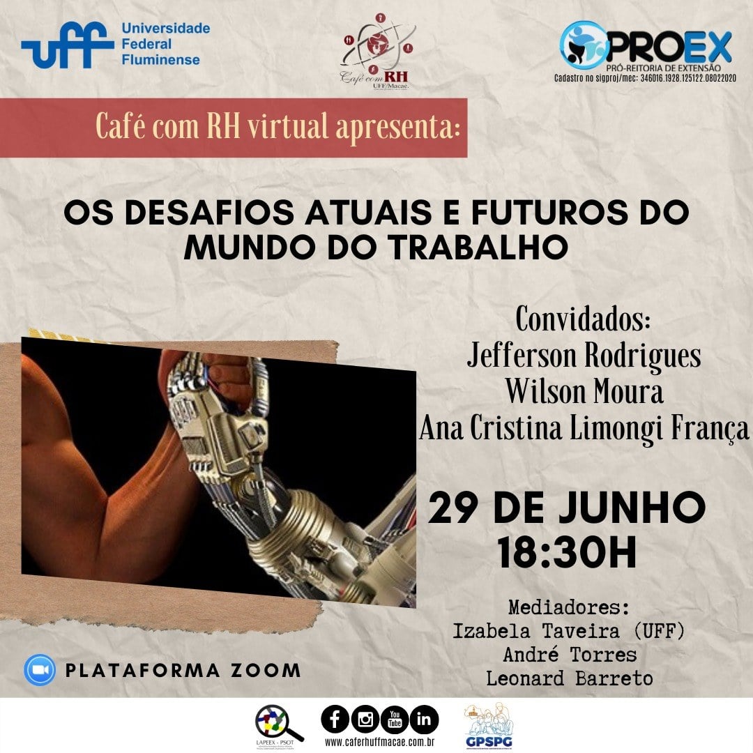 #ProexEmAção em parceria com o projeto de extensão Café com RH-UFF Macaé coordenado pela professora Izabela Taveira, divulgam o evento virtual “Os Desafios atuais e futuros do mundo  do trabalho” no dia 29/06 às 18h:30, pela plataforma ZOOM.  O objetivo do evento é trazer análises críticas e reflexivas de temas e contextos complexos  e polêmicos no mundo do Trabalho. Assim refletir sobre como  a indústria 4.0 esta criando ou reduzindo as vagas de emprego. Como também sobre o papel dos sindicatos na prevenção da precarização do trabalho e como funcionarão os sindicados frente as novas formas de trabalho virtuais, igual o Home Office. Refletir Também, sobre as novas formas de controle e alienação no trabalho na modernidade. Sobre a Whatsapização da vida e do trabalho. Além da qualidade de vida dentro e fora  do trabalho, trabalhando dentro de casa e home-office. E que tal analisar as novas formas e relações de trabalho? Estas  entre outras questões serão discutidas.