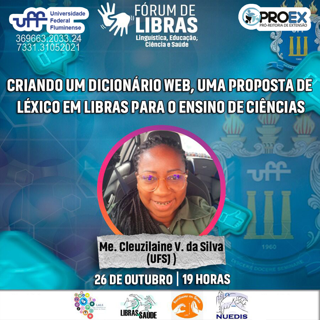 #ProexEmAção divulga o Fórum de LIBRAS: Linguística, educação, ciência e saúde com o seguinte tema: “Criando um dicionário Web, uma proposta de léxico em Libras para o ensino de ciências”. A palestra será ministrada pela Me. Cleuzilaine V. da Silva (UFSJ).