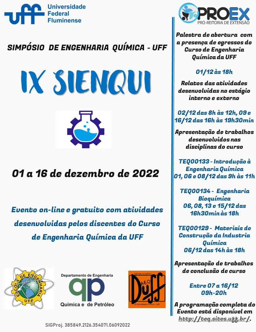 #ProexEmAção divulga o IX Simpósio de Engenharia Química da UFF (SIENQUI), coordenado pelas professoras Mônica Pinto Maia e Ana Carla da Silveira Lomba Sant’Ana Coutinho – UFF. O objetivo é apresentar para a comunidade a produção acadêmica técnico-científica desenvolvida pelos discentes do curso de Engenharia Química da UFF. O IX SIENQUI será realizado na modalidade on-line (plataforma Google Meet), no período de 01 a 16 de dezembro de 2022. As inscrições podem ser efetuadas no site http://www.extensao.uff.br/inscricao/, no período de 16/11/2022 a 01/12/2022. Os links de acesso às salas remotas serão disponibilizados aos inscritos por meio de e-mail. Os certificados de participação serão emitidos após concluída a realização do evento. A programação completa do Evento está disponível em https://teq.uff.br/?p=1237