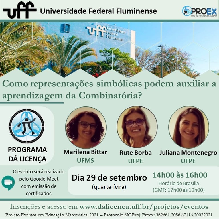 #ProexEmAção divulga que o programa de extensão Dá Licença e o projeto Eventos em Educação Matemática promoverá a palestra “Como representações simbólicas podem auxiliar a aprendizagem da Combinatória?”, a ser ministrada pelas professoras Marilena Bittar (UFMS), Rute Borba (UFPE) e Juliana Montenegro (UFPE).