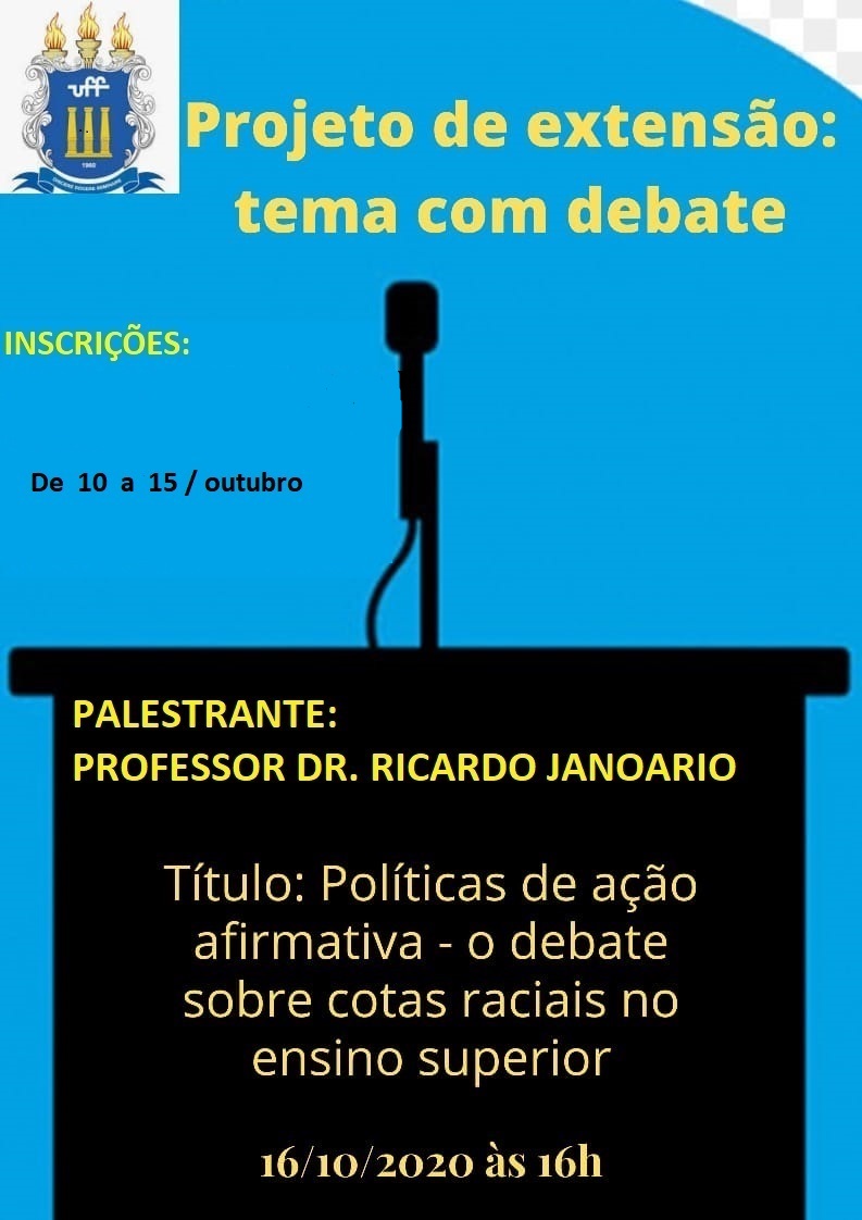 O Projeto de Extensão ‘Tema com debate’ promove, no próximo dia 16 de outubro, a palestra ‘Políticas de ação afirmativa: o debate sobre cotas raciais no ensino superior’, com o professor Ricardo Janoario. O evento é gratuito e ocorre, via plataforma Google Meet, das 16h às 18h.