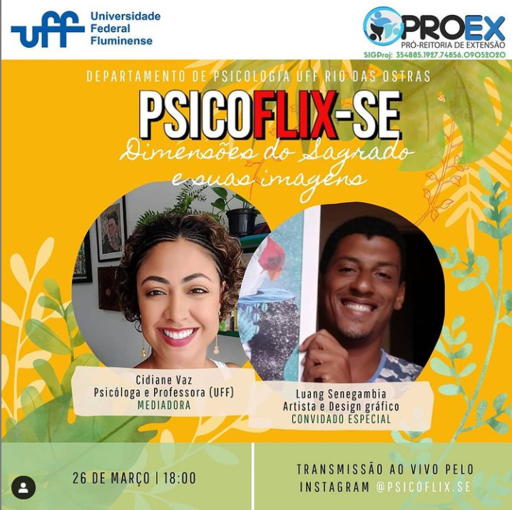 A conversa desta sexta-feira, dia 26 de março, no projeto psicoflix-se será com Luang Senegambia sobre o documentário Cárcere dos deuses. O convidado é graduado em Design Gráfico pela PUC-Rio e desde 2014 desenvolve uma série de colagens digitais que manifestam seu sentimento sobre a cultura Afro-brasileira, principalmente através dos Deuses Yorubás.