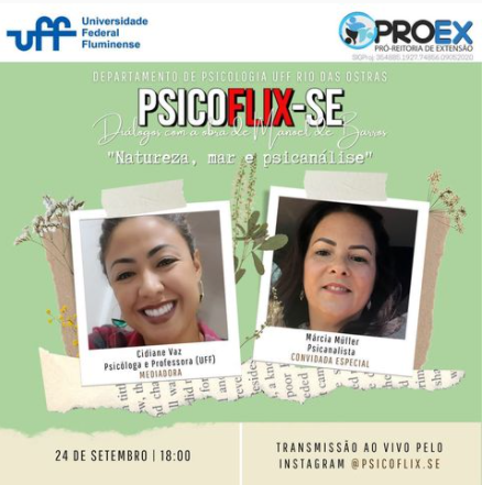 Nesta sexta-feira, dia 24 de setembro, o projeto Psicoflix.se contará com a presença de Márcia Müller para conversar sobre natureza, mar e psicanálise. A convidada é psicanalista, mestre e doutora em Psicologia pela UFRJ, lançou o livro ‘Psicose, nós e remendos’, atua na Clínica Falasser e é professora substituta na UFF Rio das Ostras. Participa do coletivo ‘Dobradiças na Psicanálise’ que aposta justamente nas interfaces com a sociedade, universidade, literatura e cultura. Como potente amante do mar e da natureza, traz o seguinte pensamento: “se podemos psicanalisar (e viver) com Manoel de Barros, por que fazê-lo sem?”.