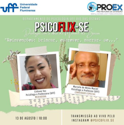Nesta sexta-feira, dia 13 de agosto, o projeto psicoflix.se  contará com a participação especial  do professor de psicologia do Campus UFF de Rio das Ostras, Marcelo de Abreu Maciel,  que abordará  o tema “Reinvenções: brincar, escrever, narrar-se…” .
