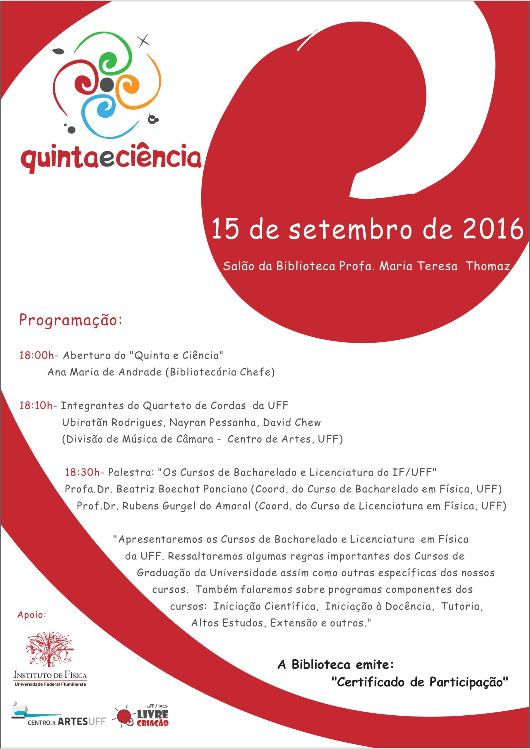 Neste mês, o QuintaeCiência, nosso evento de divulgação científica e cultural, será no dia 15/9, a partir das 18h, como usual na Biblioteca do IF-UFF. Teremos uma apresentação de integrantes do quarteto de cordas da UFF, seguida de palestra dos coordenadores dos cursos de Bacharelado e Licenciatura do IF-UFF. Todos são bem-vindos!